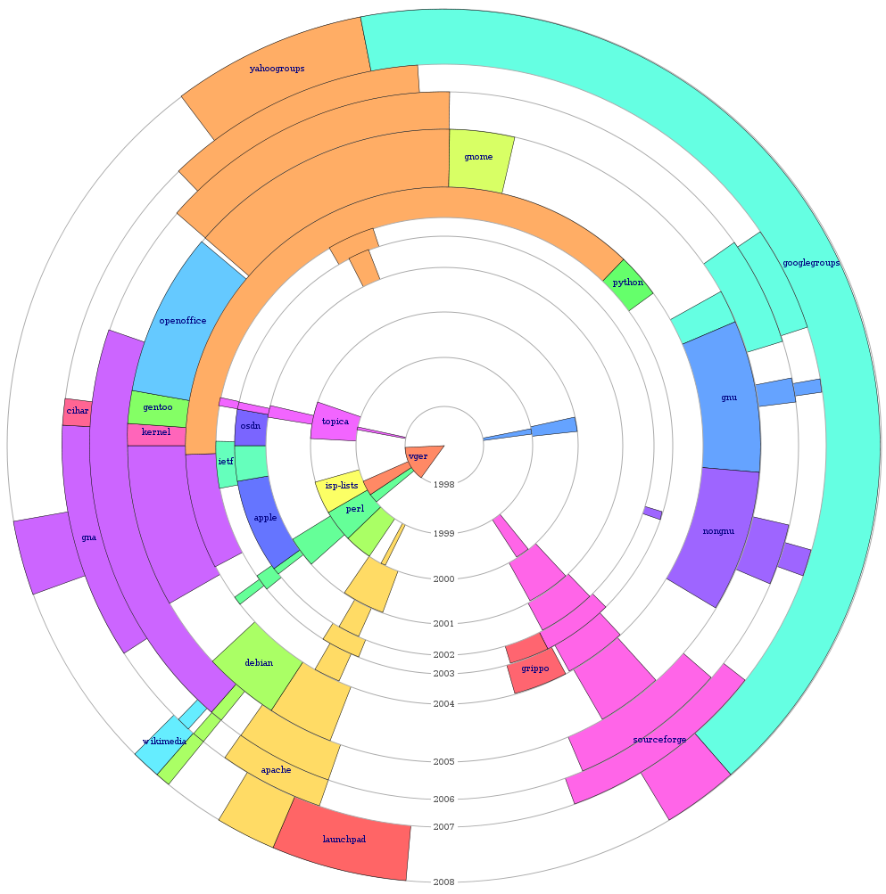 To:header as well as other places. A few lists do funny tricks with email headers, and try to hide the name of the list. Spammers are notorious for forging and hiding headers. Sometimes even legitimate lists will try to hide the listname. This is most common when the list is for one-to-many communications, as opposed to many-to-many communications. Any list that mangles email headers to hide its name is incompatible with the service and will not be archived. We do not archive lists whose name does not begin with a letter. We've found that list names beginning with numbers or unusual punctuation are almost always noise, i.e. unsolicited commercial email or spam. The illustration shows growth (one year per ring) of some major users of The Mail Archive. - Can I delete a message from the archive?
