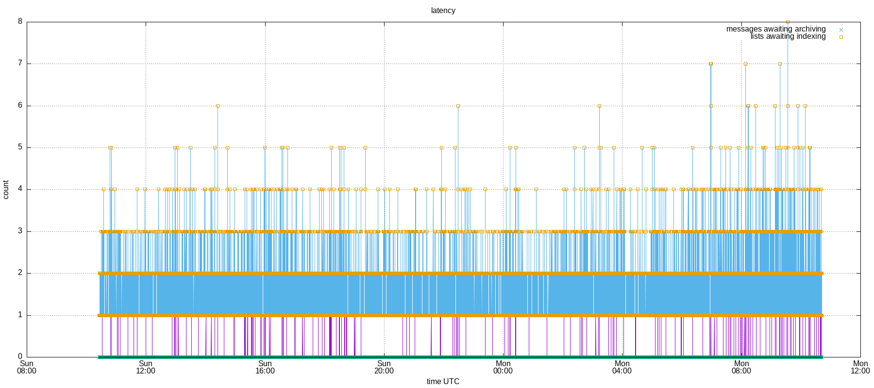 Archiving latency can vary dramatically. First, The Mail Archive has a never ending capacity battle. More and more people use the service, slowing down archiving performance. We upgrade the software and hardware to keep pace, improving performance. Second, under high load the service gracefully switches over to a more efficient batch mode, which means that many messages are processed at a time, not necessarily in the order received. Archiving latency is an important metric and under typical operating conditions messages appear in the archives within minutes of receipt. However, performance depends greatly on message traffic patterns. The graph shows how many messages are piled up and waiting in the service's inbox at any given time.